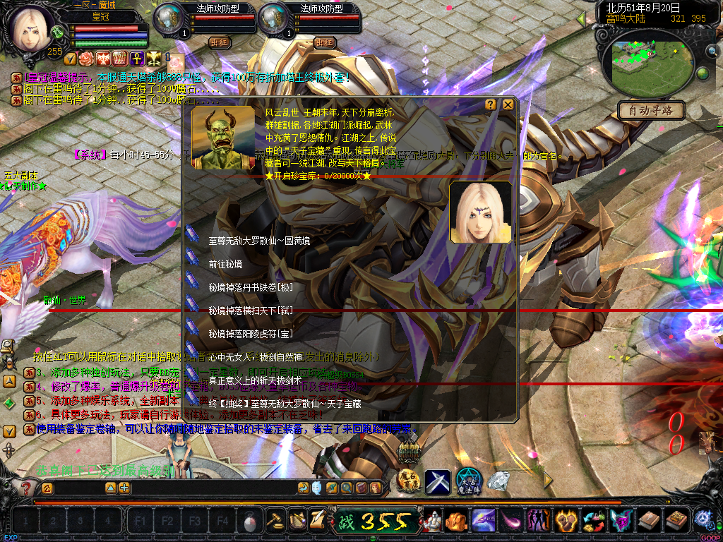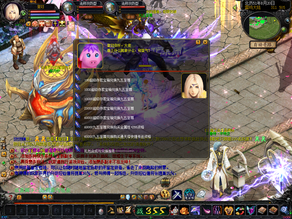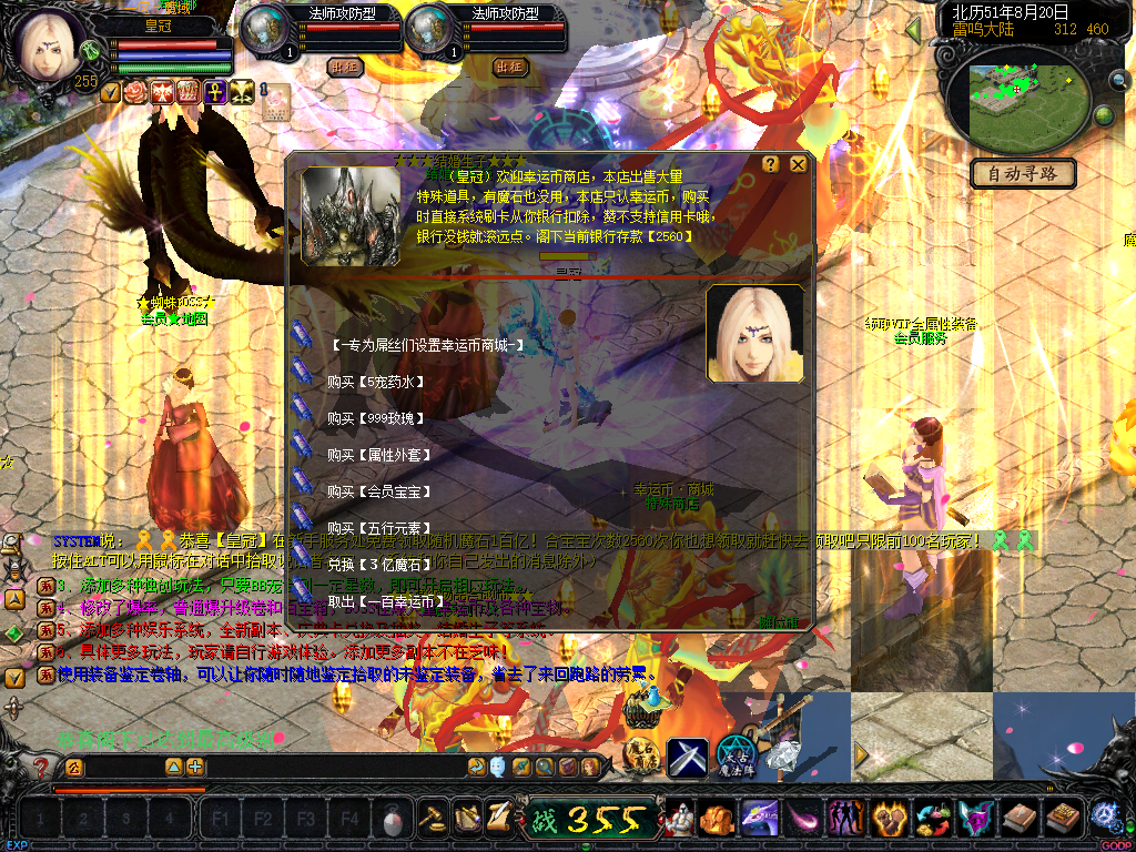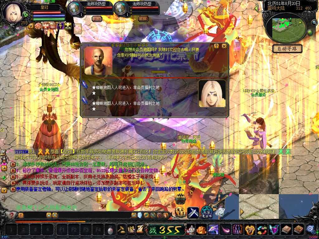 01、上线送VIP10人物255级和赠1000万MS,仓库对面会员NPC处领取全属性+255555装备一套.还可以一键学习本职业所有技能!雷鸣门口NPC领取!bs入包500万,蜘蛛王入包1000万