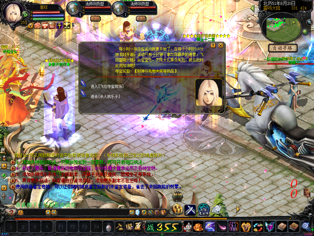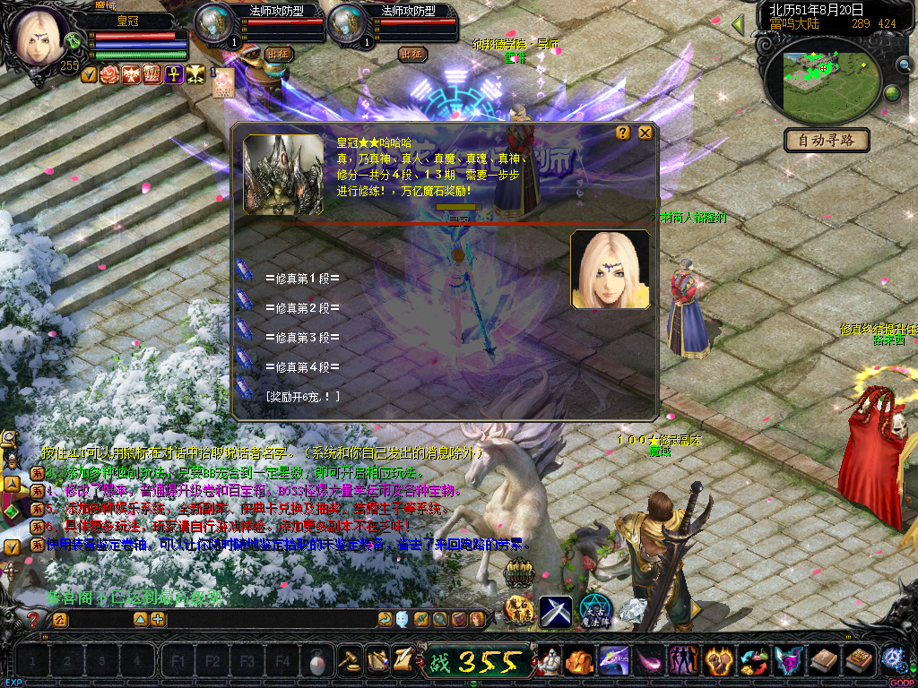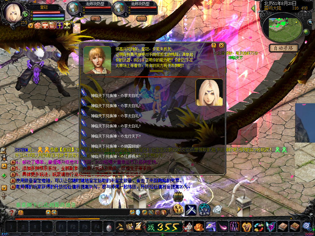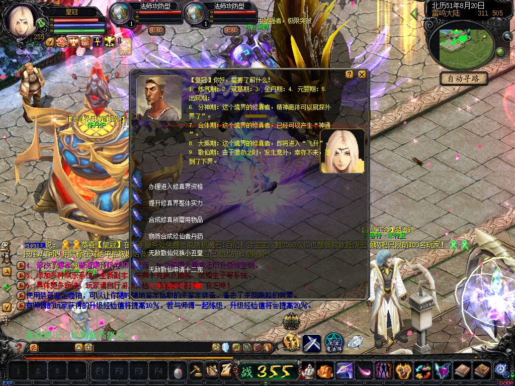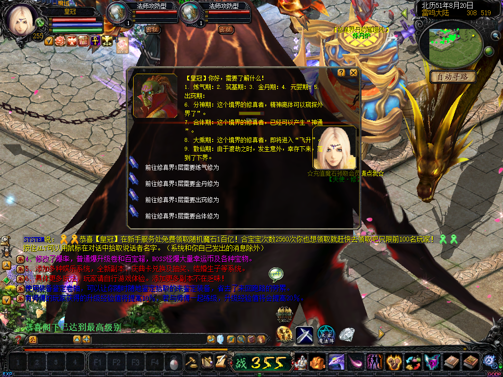 01、上线送VIP10人物255级和赠1000万MS,仓库对面会员NPC处领取全属性+255555装备一套.还可以一键学习本职业所有技能!雷鸣门口NPC领取!bs入包500万,蜘蛛王入包1000万