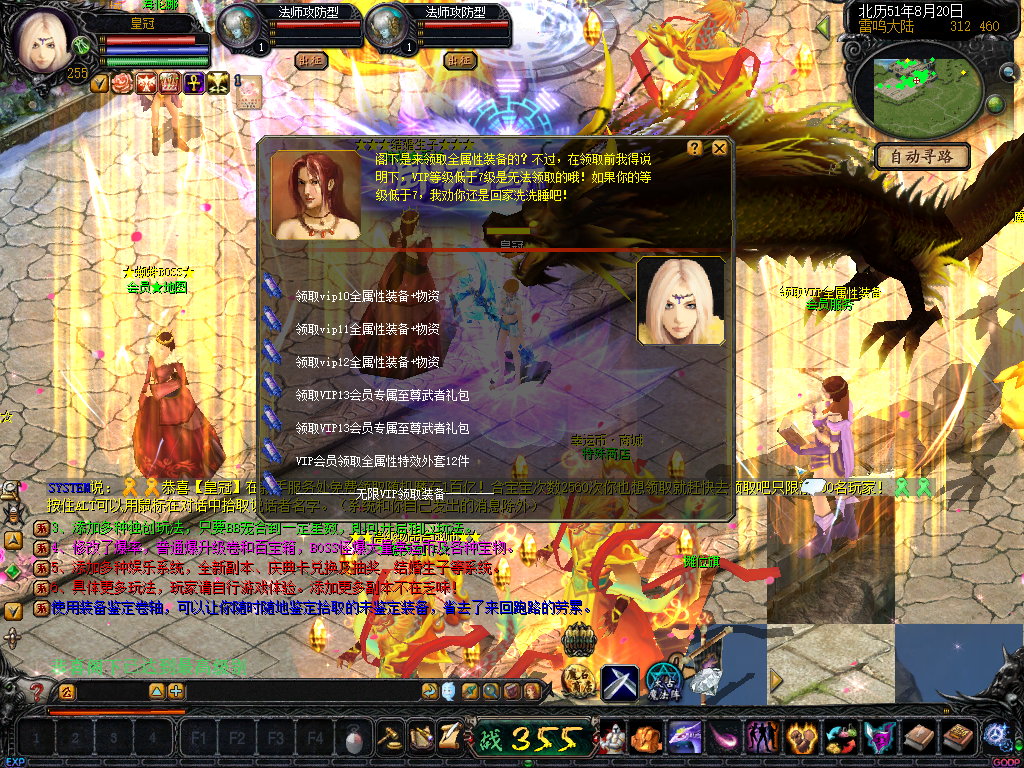 全属性+255555555装备一套(含外套+坐骑+ 会员宝宝)【boss2000万, 蜘蛛王后5000万】天使修旁边NPC自动领取VIP13套餐物资