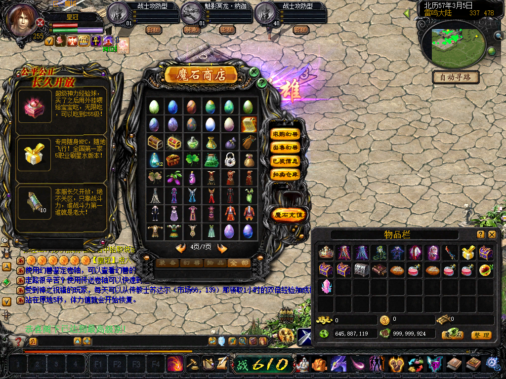 【游戏介绍】为普通玩家准备了神力经验球,宝宝吃5个132级。魔石店可购买。宝宝最高137级,人物最高255级