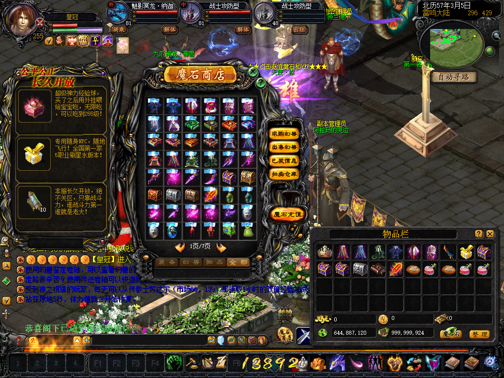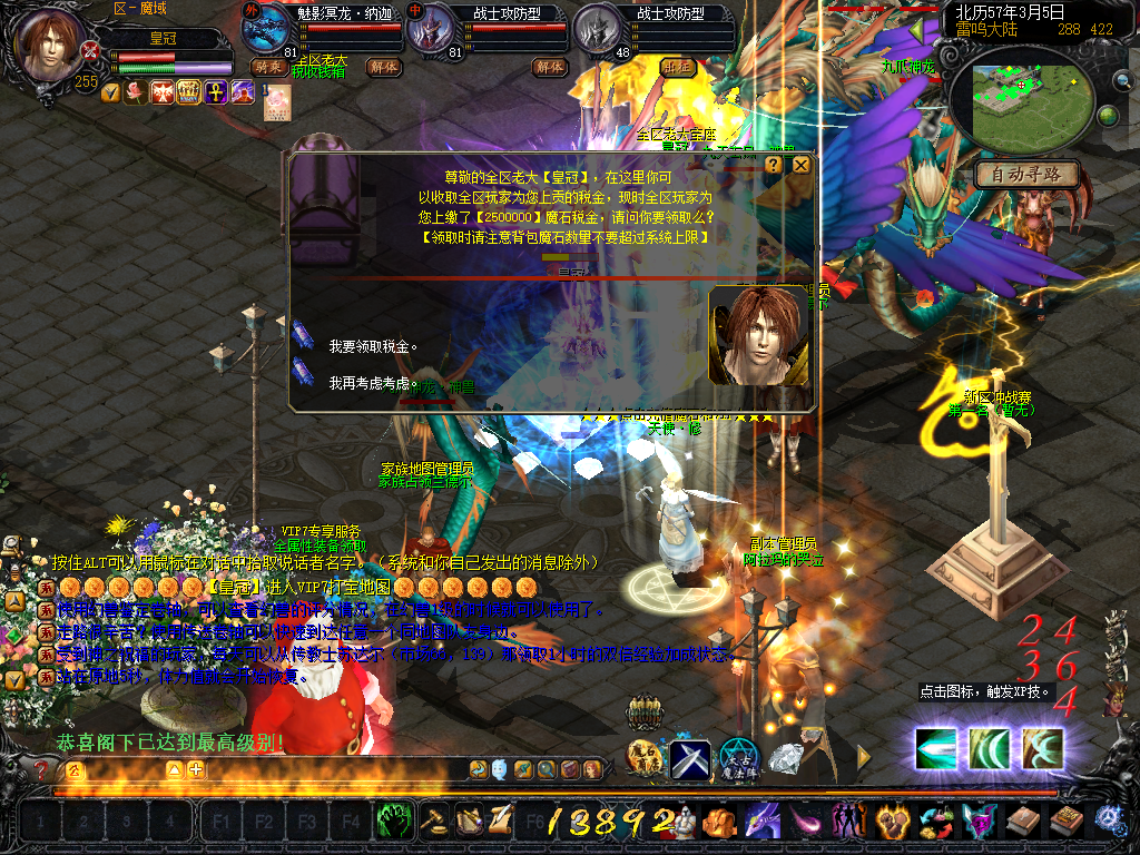 全区老大奖励:在雷鸣门口可占领全区老大,占领之后可以收全区魔石保护费,团战传送功能,特效装逼外套