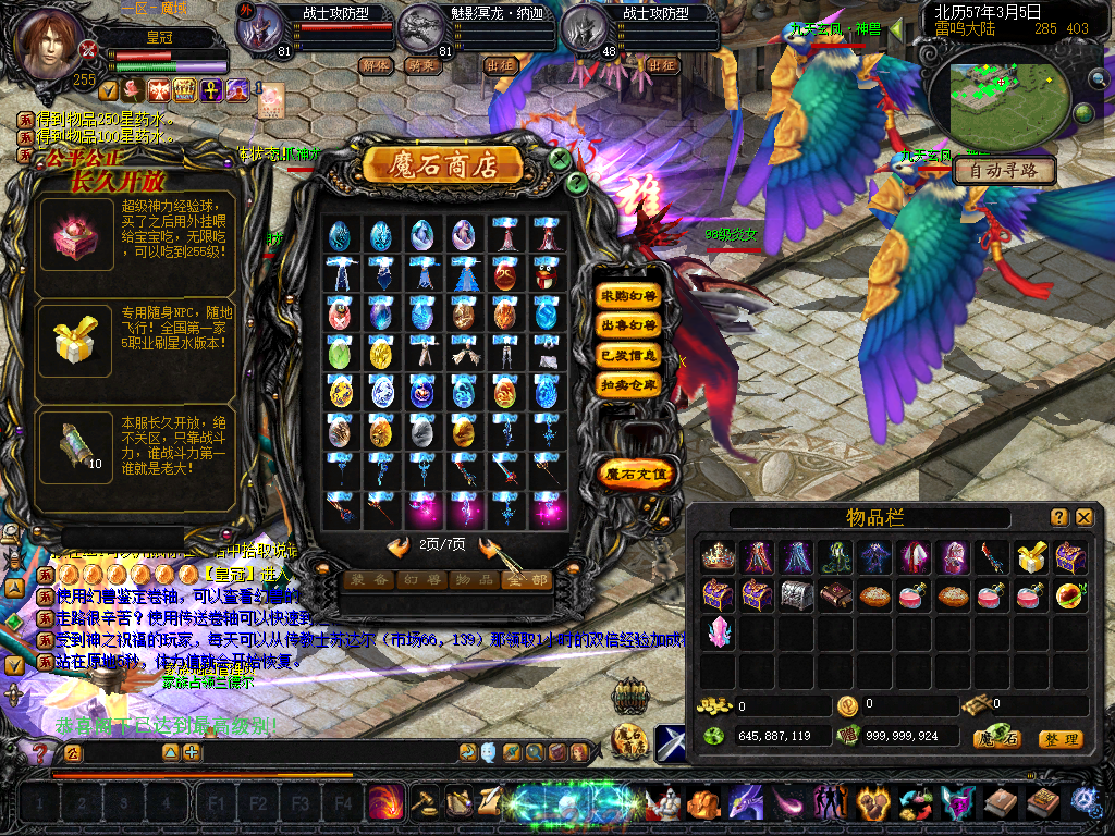 送人物255级, BOSS入包50万,蜘蛛王入包100万魔石,送(地-水-风-火)全属性+255装备一套【游戏里全属性装备处NPC自动领取】