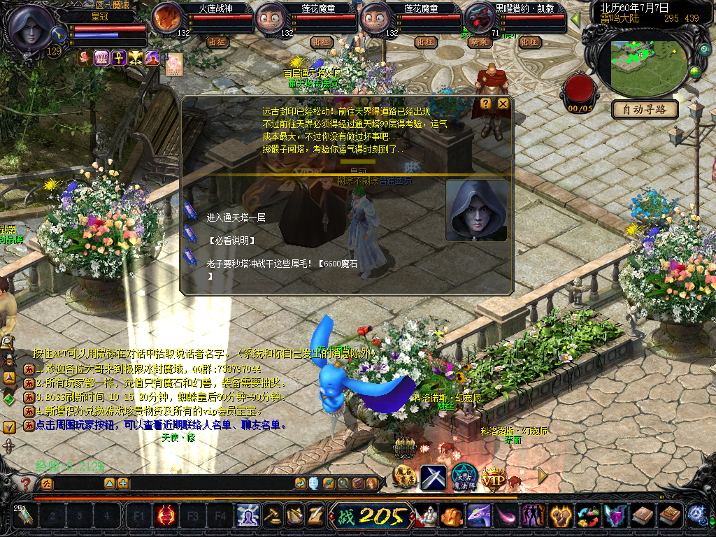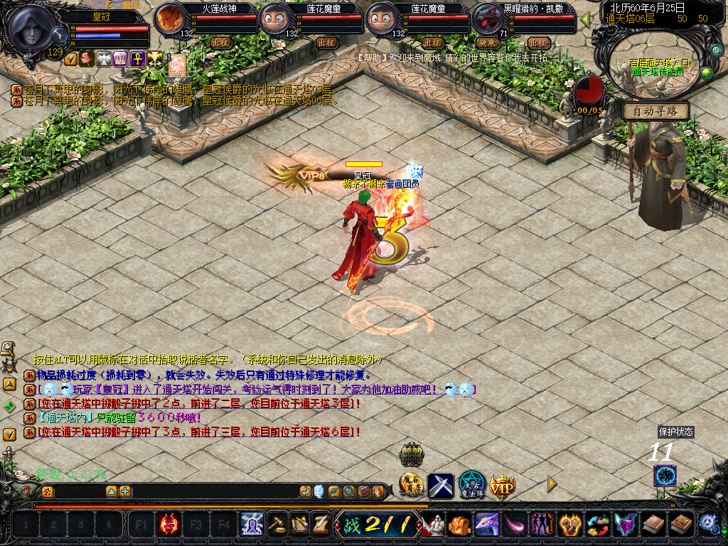 【 通天塔】 100层通天塔至尊1个小时刷新,掉落6星花语礼包、8星花语礼包、月光宝盒、电浆药水、灵魂王等物资。