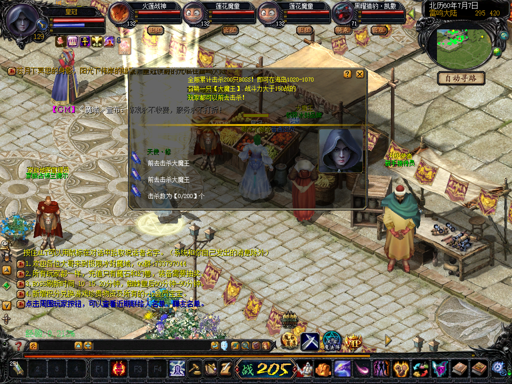 【大魔王】游戏中每刷200个boss,会在大魔王地图中刷新一只大魔王,可通过雷鸣交易行门口npc进入地图,刷新时有提示,爆大量物资。